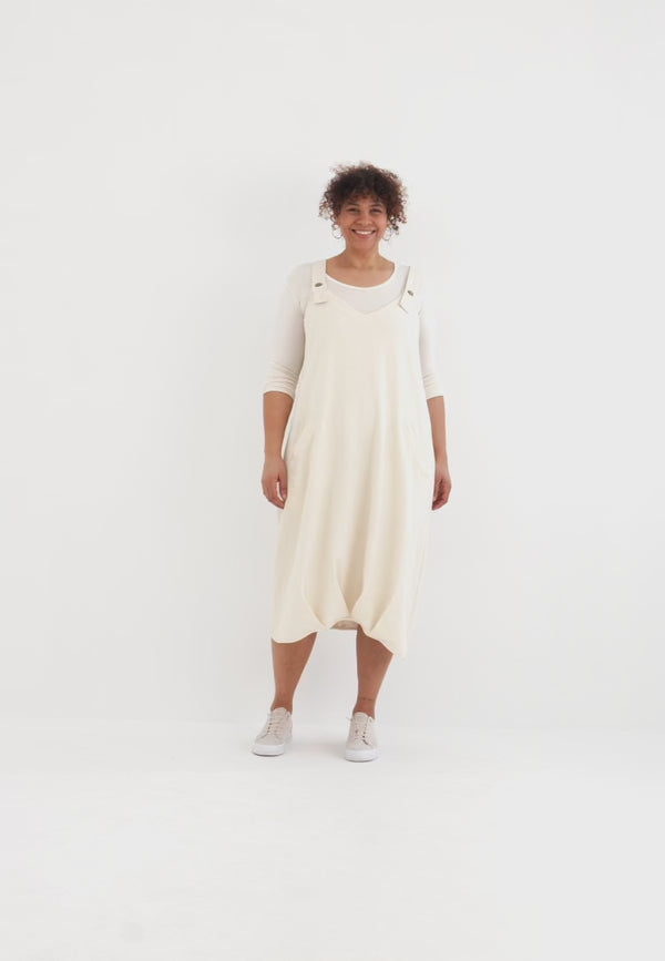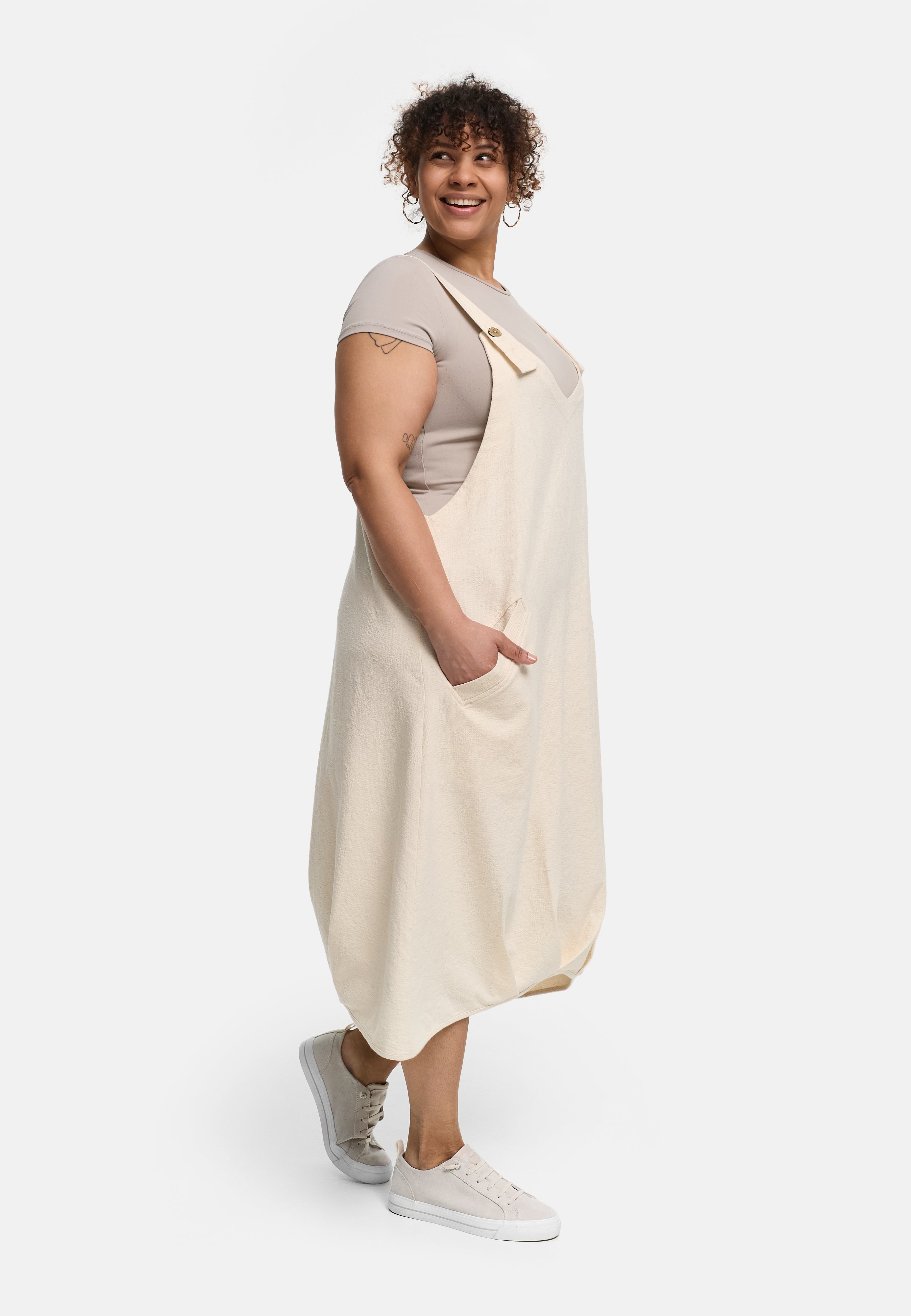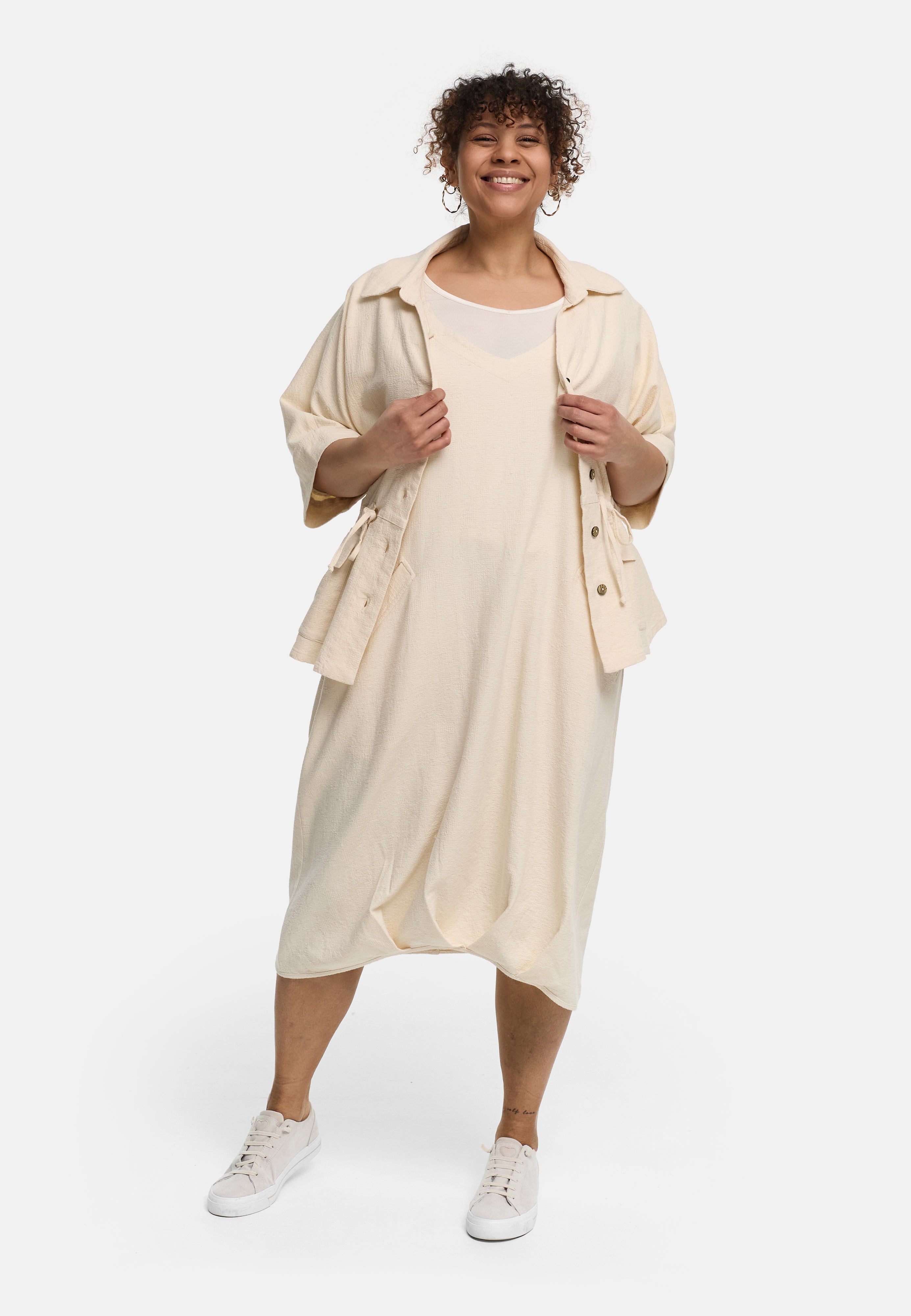 Ob solo mit Shirt darunter, als ruhiger Natural Look mit Sneakern oder kombiniert mit der passenden Linaya-Jacke – dieses Kleid steht für luftigen Komfort, unkomplizierte Vielseitigkeit und zeitlose Modernität.