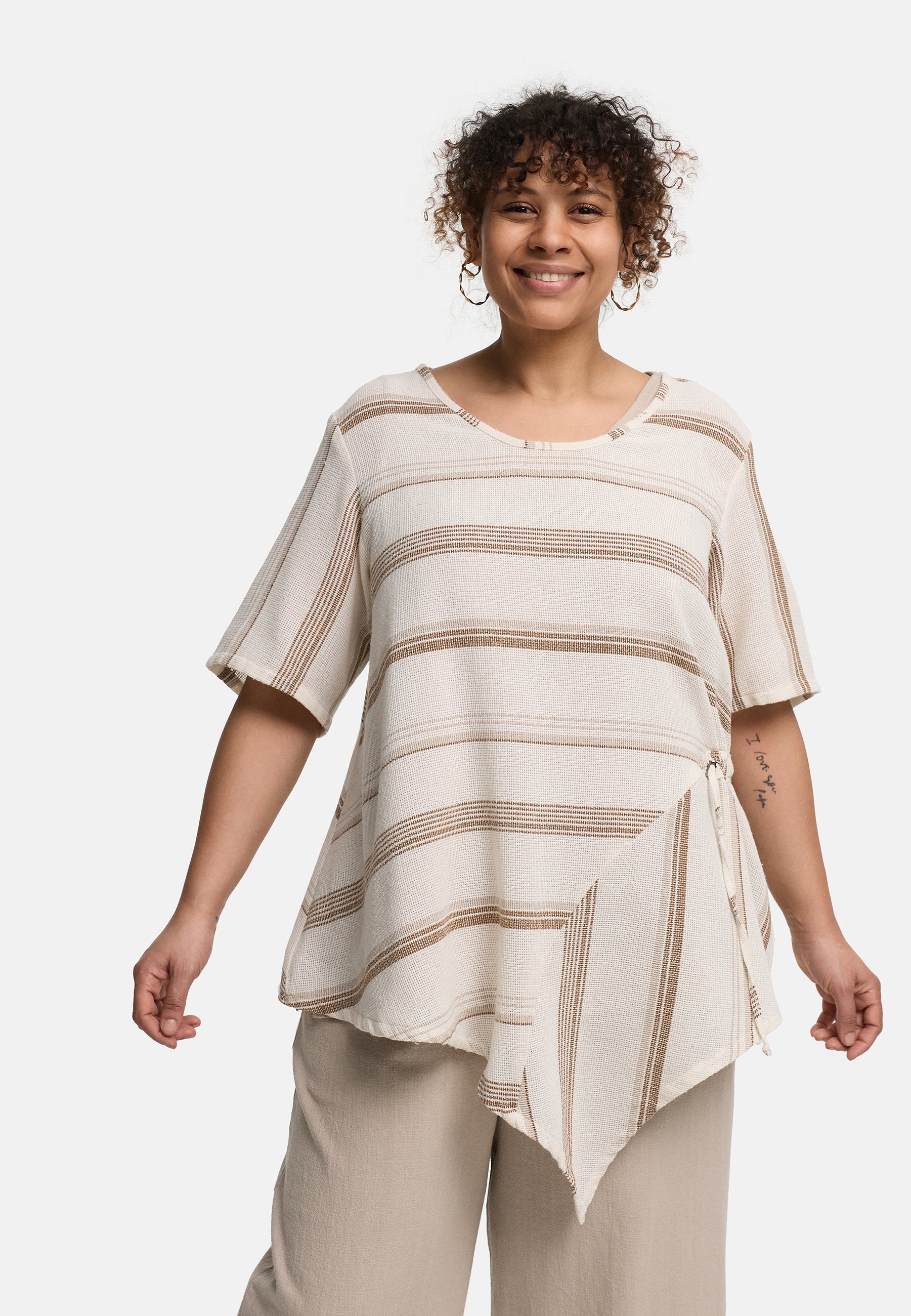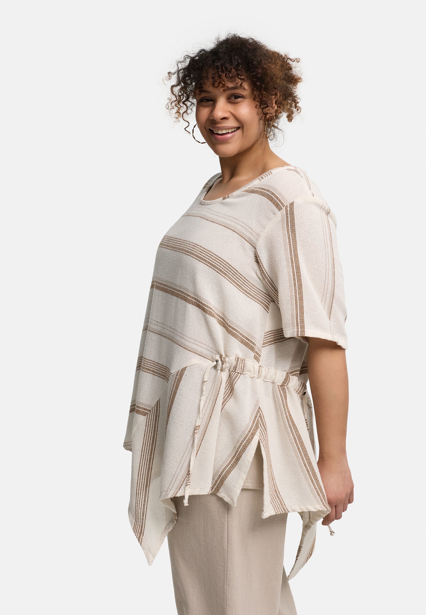 Besonderes Highlight ist das seitliche Bindedetail, mit dem du die Passform individuell anpassen kannst – locker fallend oder leicht tailliert. Der asymmetrische Saum unterstreicht die fließende Silhouette und verleiht der Tunika eine moderne, dynamische Ausstrahlung.
