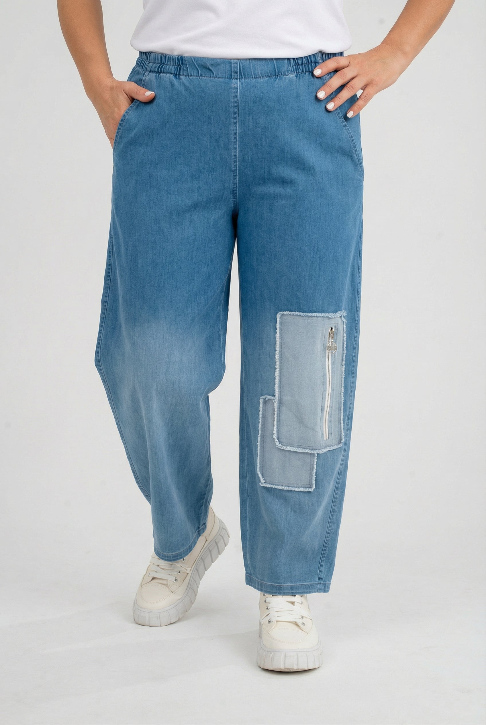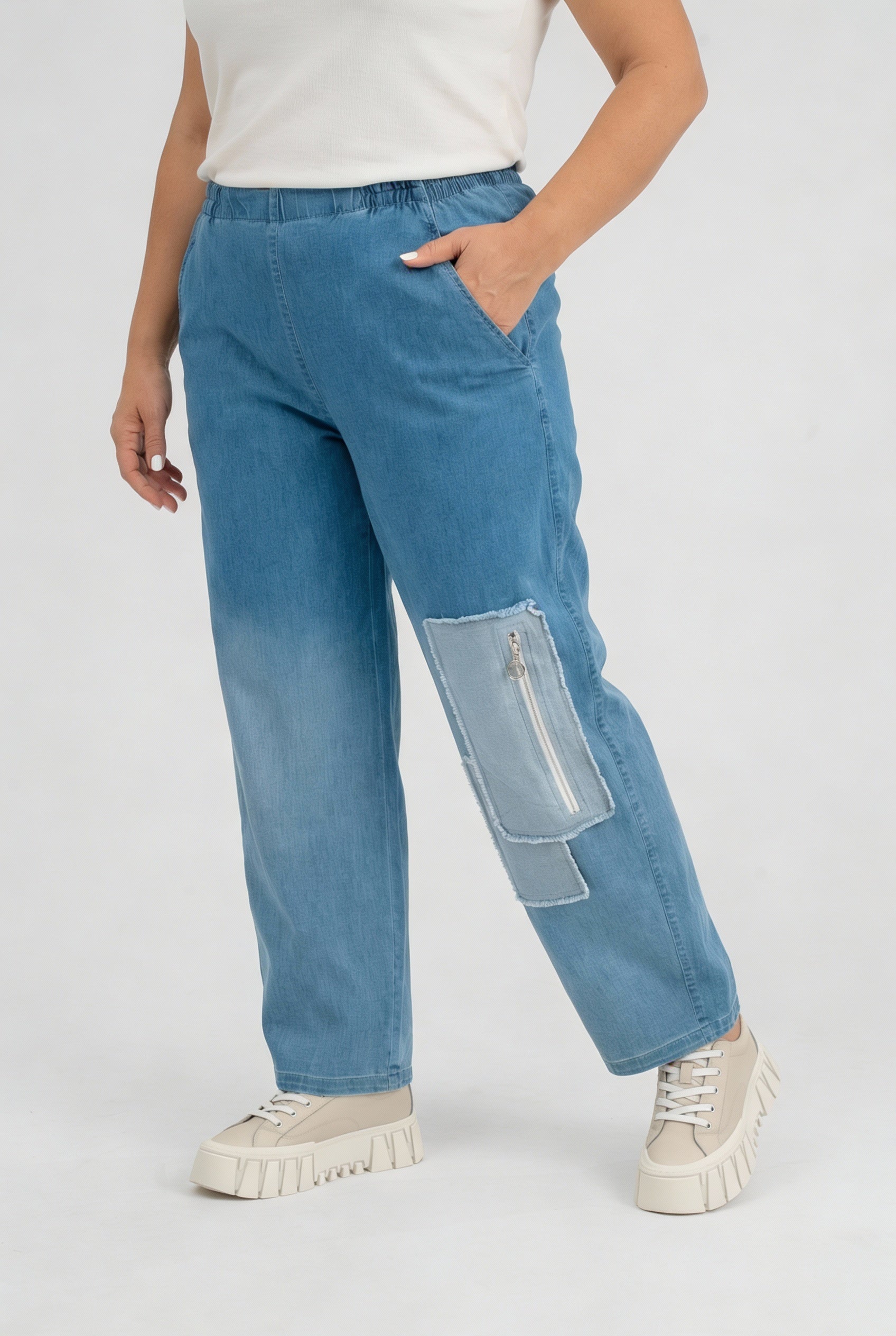 Einfach reinschlüpfen und gut aussehen: Komfortbund, weiches Stretch-Denim und eine lässige Ombre-Waschung – die „Sky“ Hose ist dein Everyday-Liebling mit stylischem Patch-Detail.