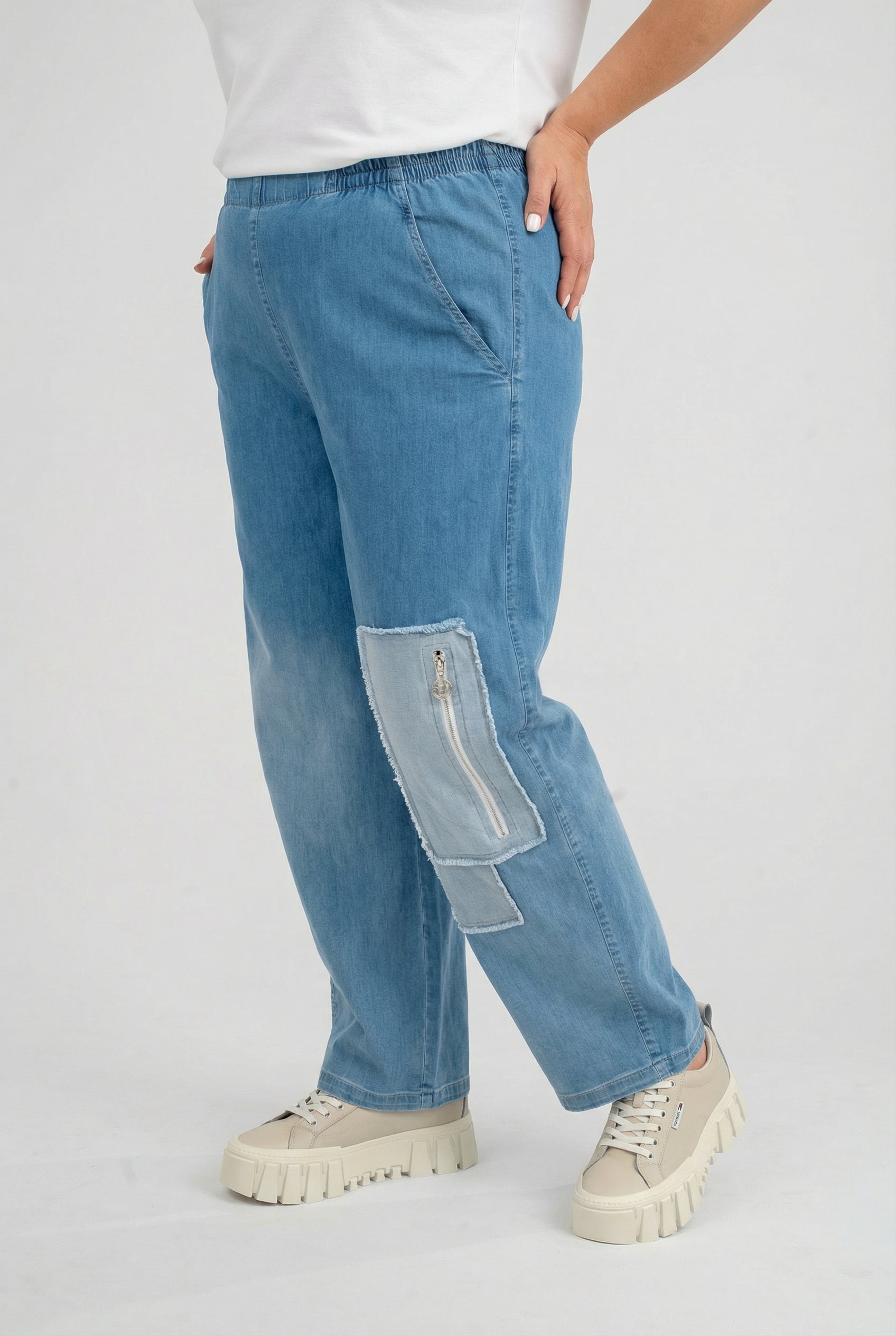 „Sky“ setzt auf entspannten Chic. Das lockere, gerade Bein schmeichelt der Silhouette und lässt Raum für Bewegung. Raw-Edge-Patches und die markante Zipper-Pocket am Bein sorgen für einen modernen Blickfang, die Ombre-Färbung verleiht Tiefe und Frische. 98% Baumwolle garantieren angenehme Atmungsaktivität, 2% Elasthan bringen genau den Stretch, der den ganzen Tag komfortabel bleibt – von City-Errand bis Café-Date.