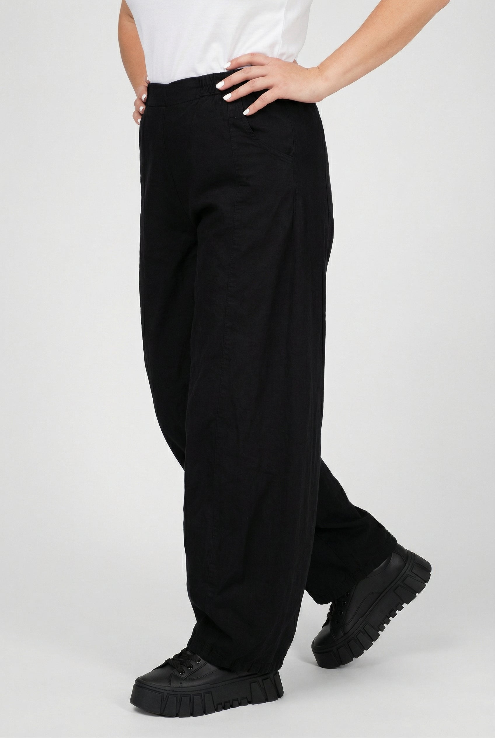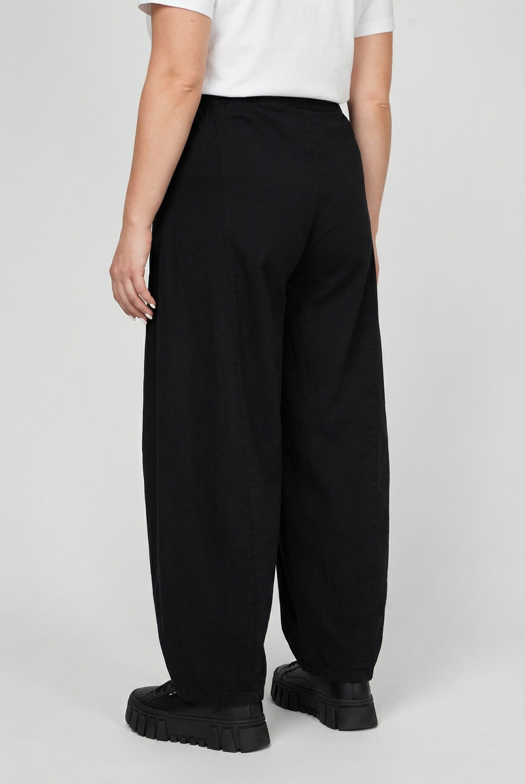 Die „Saria“ Hose vereint puren Baumwollkomfort mit lässiger Weite – easy anzuziehen, bequem am Bund, luftig am Bein.