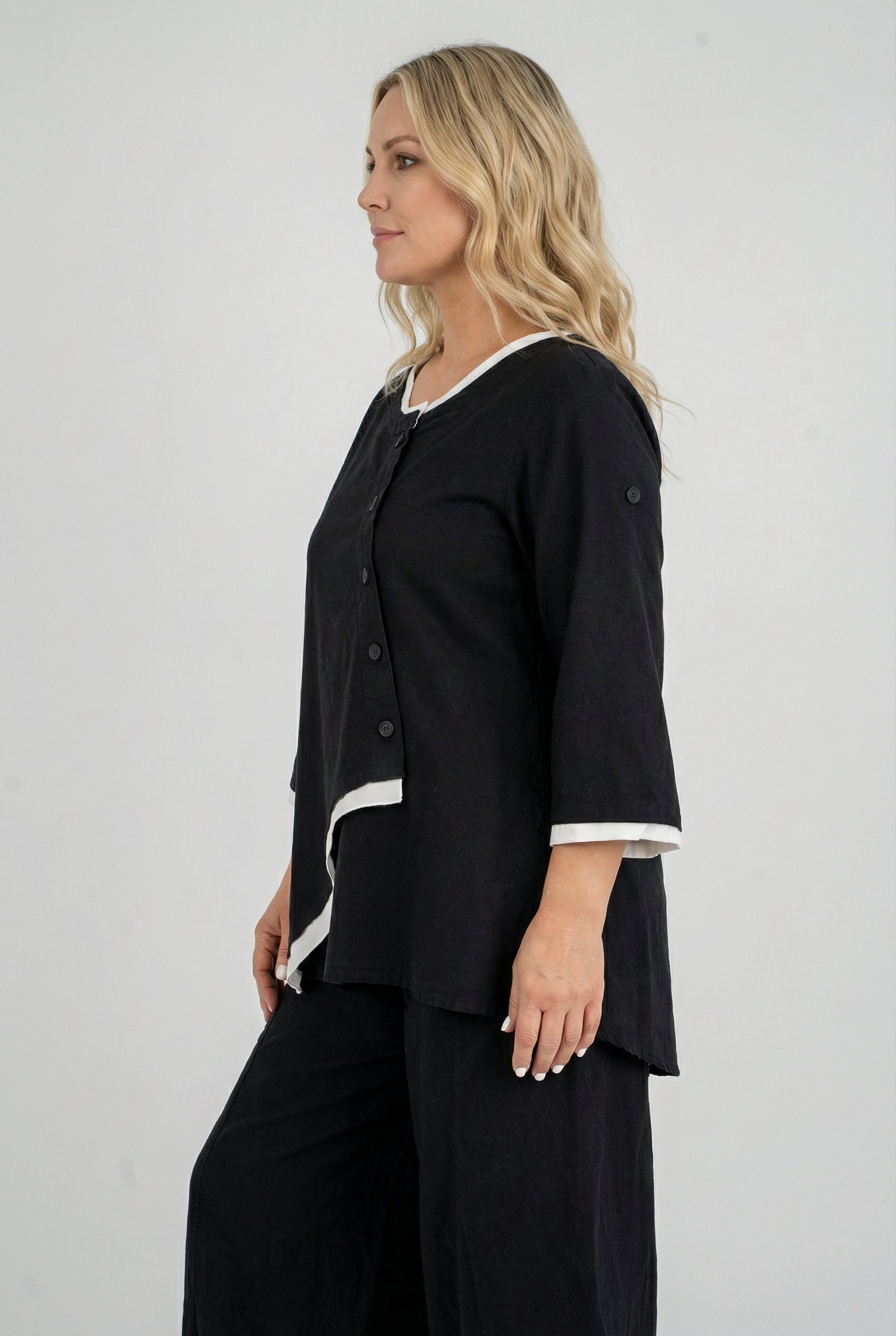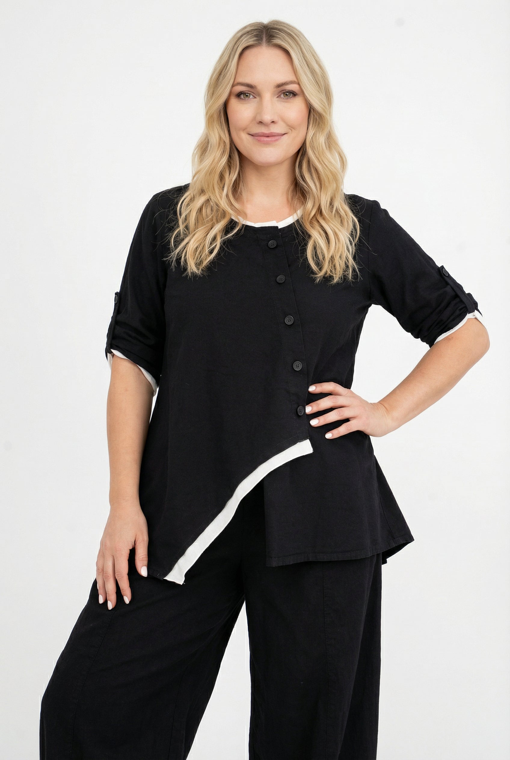 Wenn Basics ein Update bekommen, sieht es so aus: „Saria“ spielt mit klaren Linien und einer schrägen Knopfleiste, die dem Look Charakter gibt. Die 100% Baumwolle fühlt sich angenehm natürlich an, ist atmungsaktiv und macht jede Bewegung mit. Der Rundhalsausschnitt mit Kontrastkante rahmt dezent das Gesicht, während der leicht ausgestellte Schnitt locker über die Hüfte fällt. Aufschlag-Ärmel mit Riegel erlauben ein schnelles Umschlagen – perfekt, wenn der Tag von Meeting zu Café wechselt.